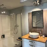Chez Aurélie&Mathieu studio dans ancienne maison rénovée proche du Lac présente une salle de bains avec une toilette séparée et une douche. Un sèche-cheveux et des serviettes sont également fournis pour votre confort.